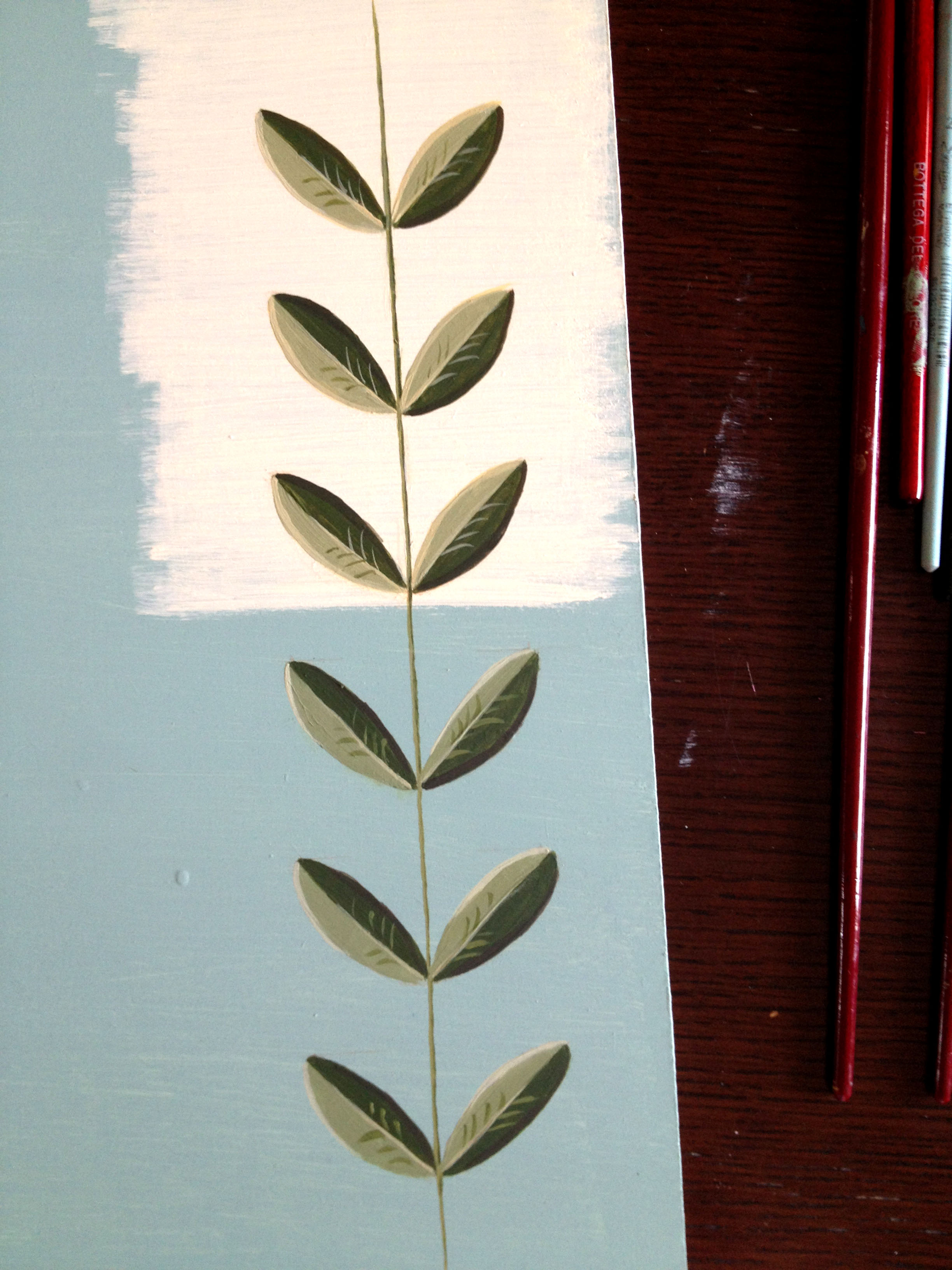 This leaves motif is an example I use for my decorative class. It is an acrylic paint on a wooden board realized to point out how a background color choice can have an effect on a decoration. On the upper part of the project there is a warm light cream background that enhances the green leaves motif, and a cold light blue that tends to reduce the attention from the decoration on the bottom half. Two diverse solutions meant for different purposes.