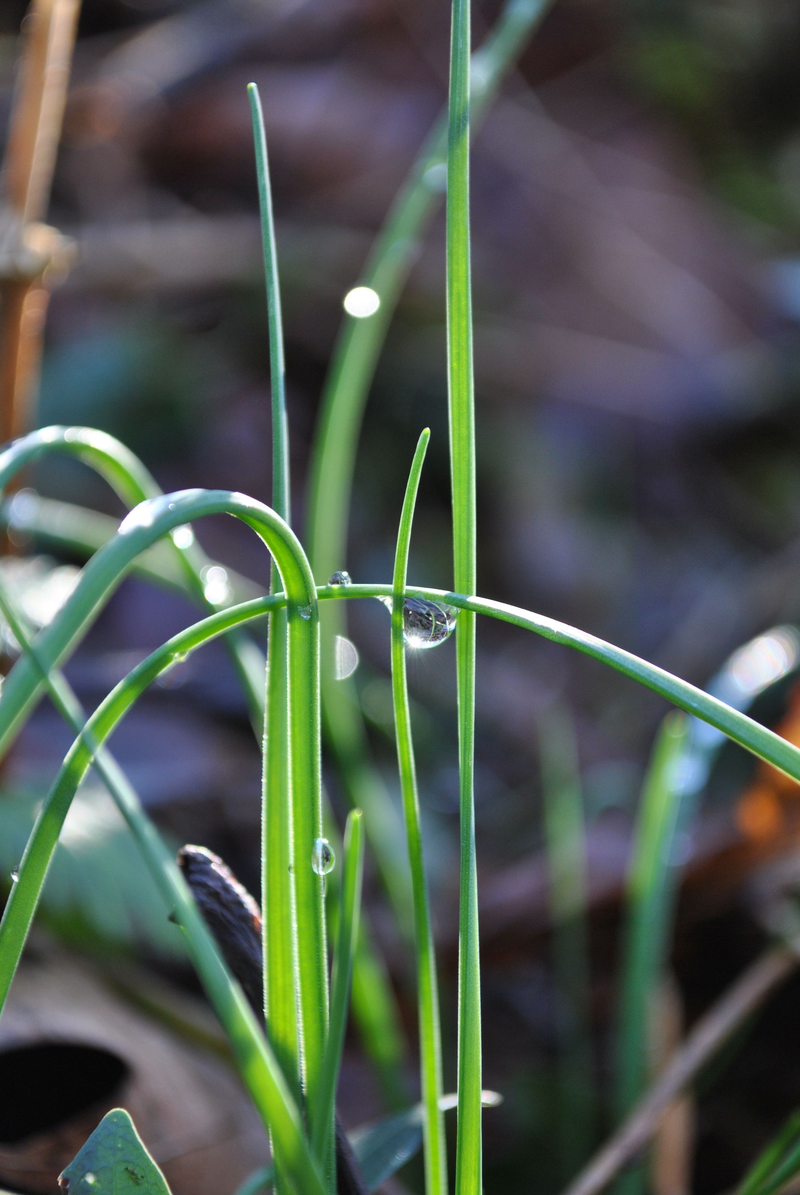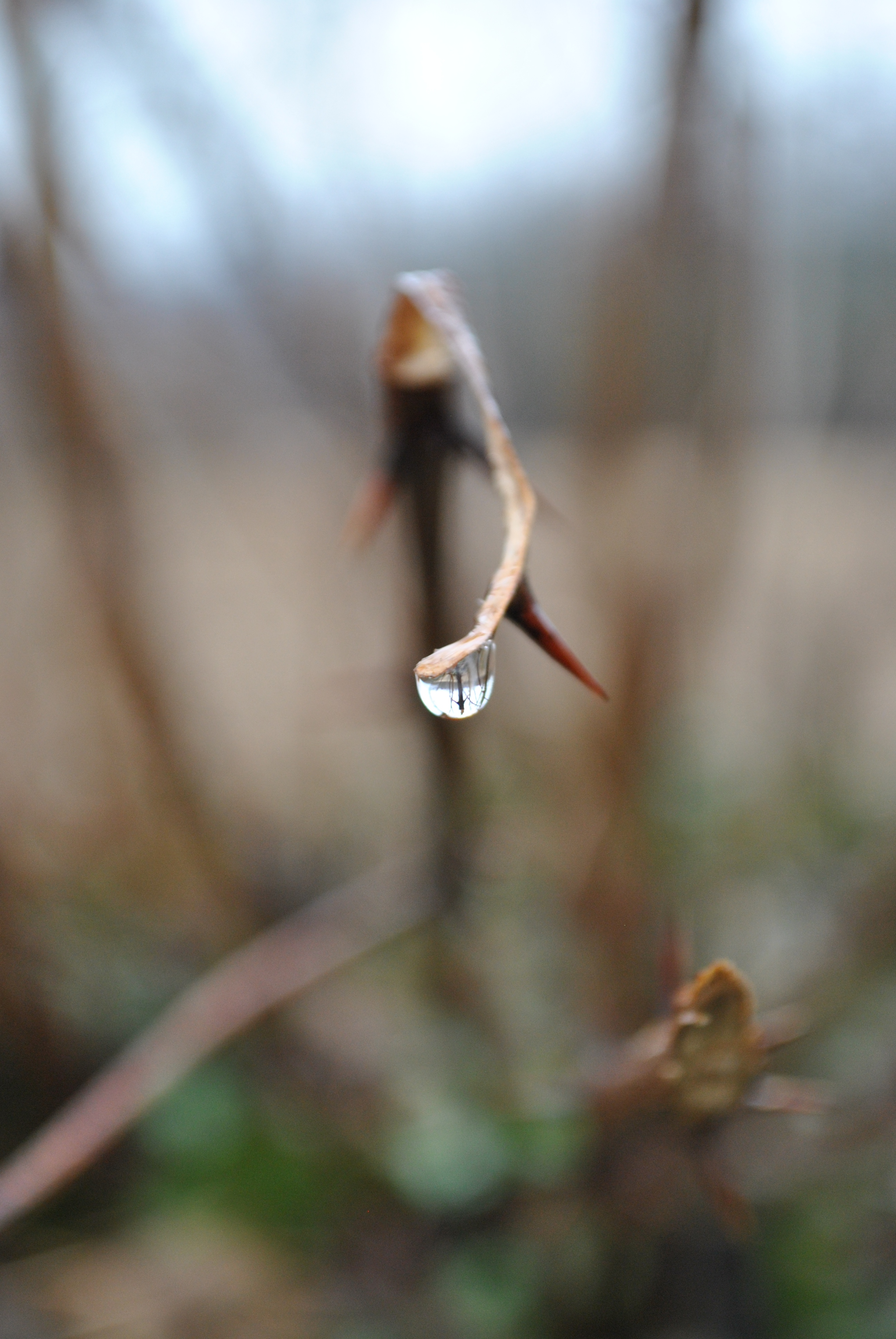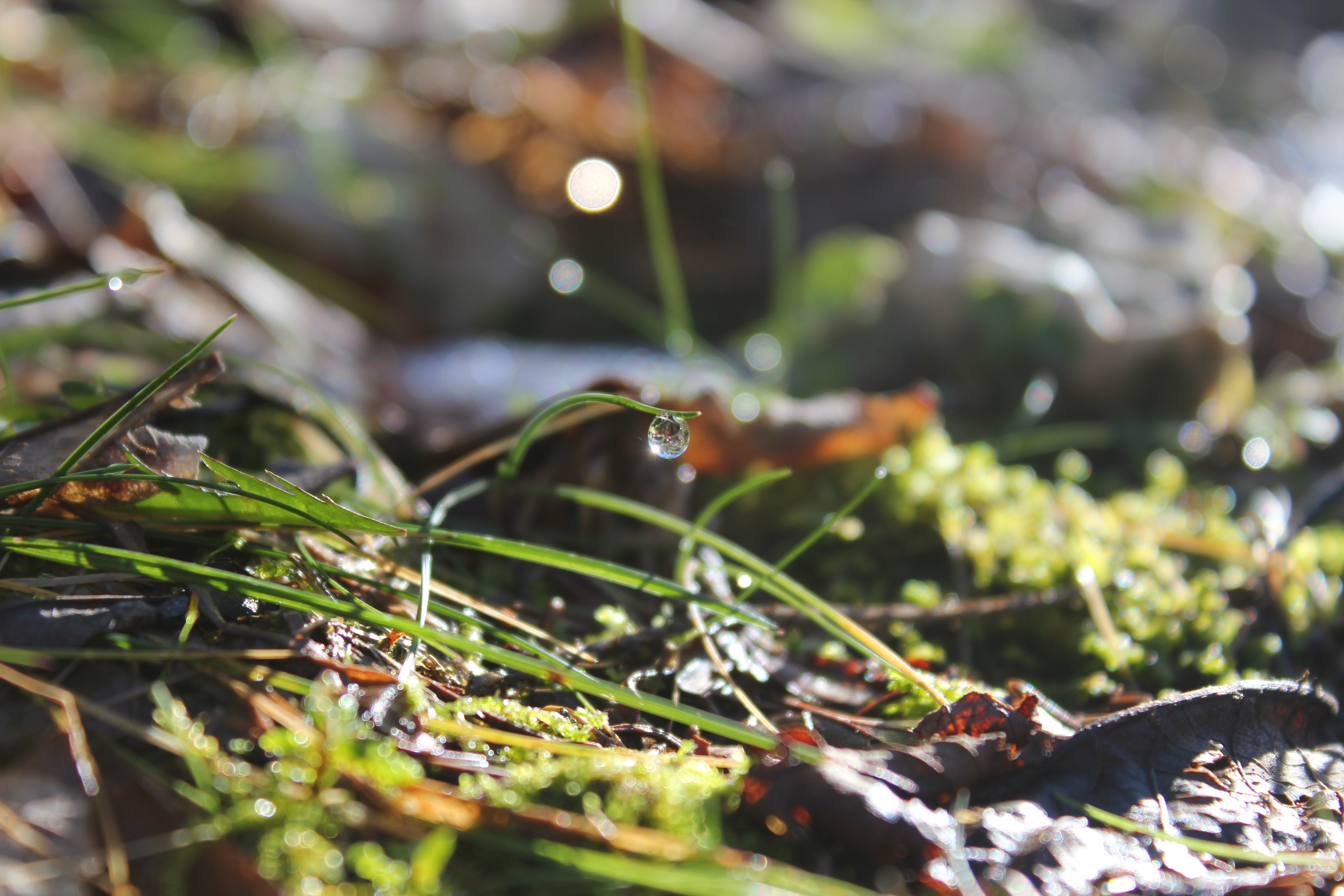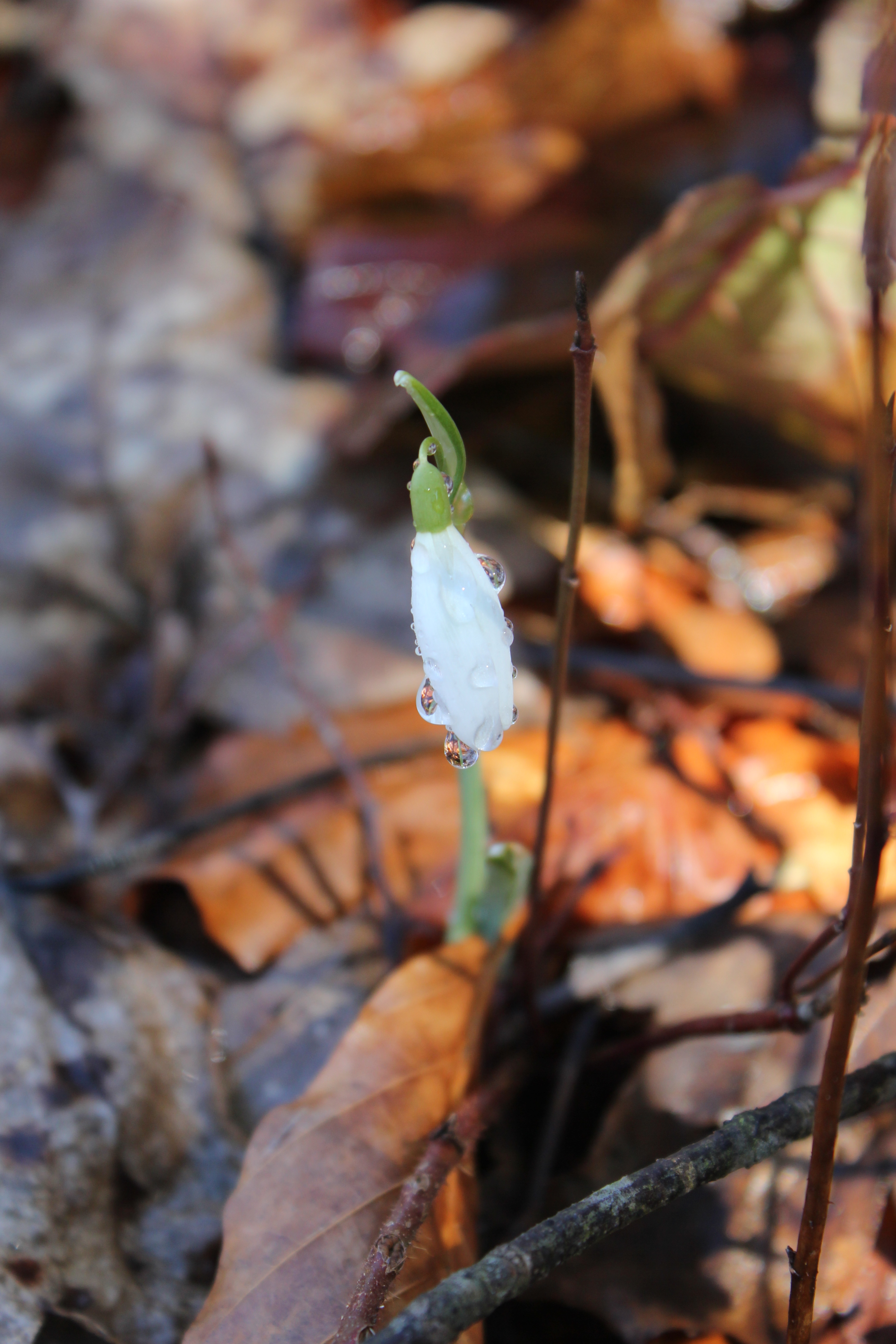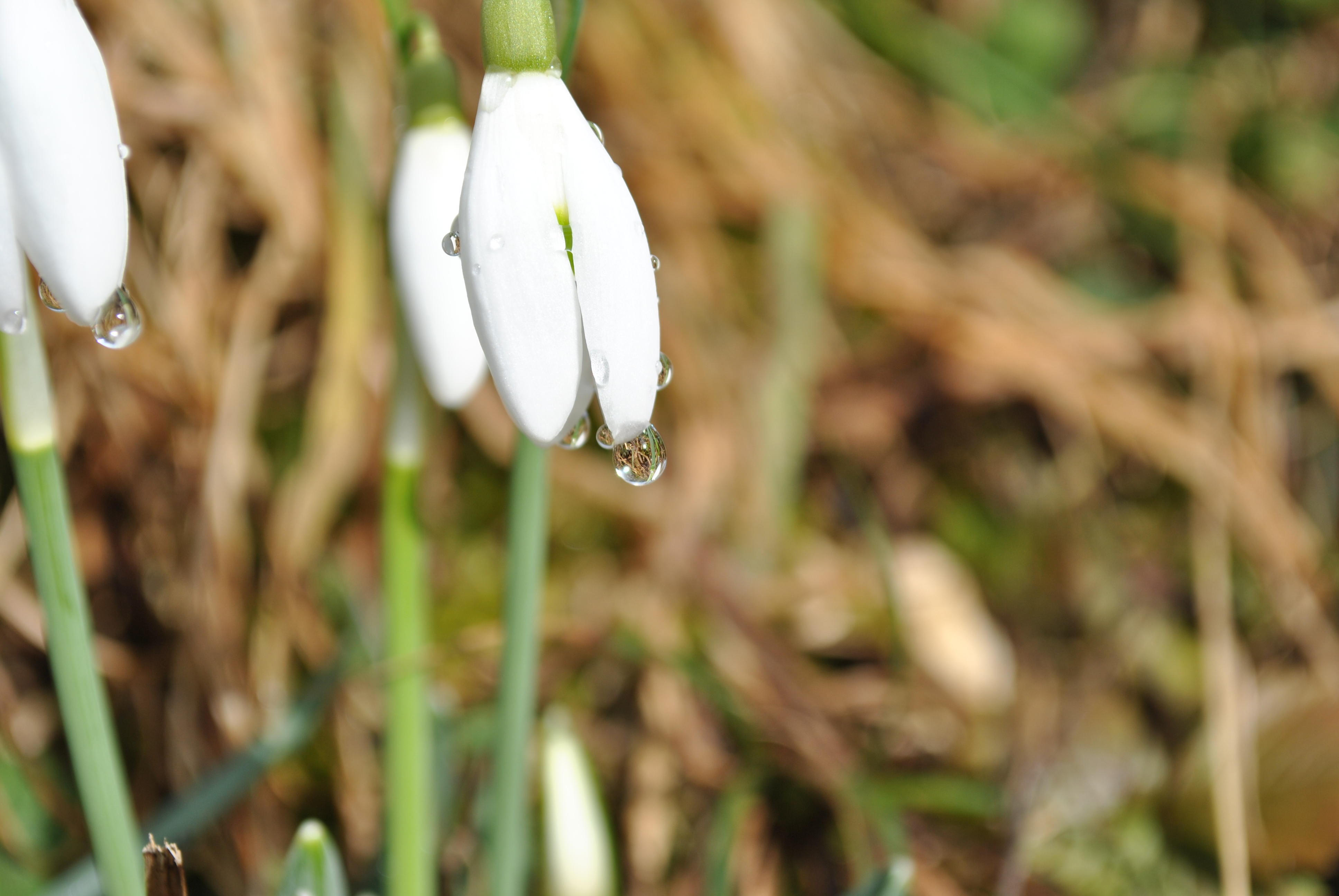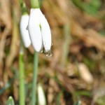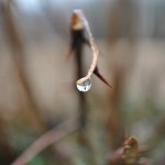 Rain has at last stopped falling, and only wetness is left on the ground, witnessing the end of this damp grey season. Nature is preparing for its rebirth unveiling the green, vivid, and crisp colors of Springtime. Grass blades embellish their fresh fibers with clear diamond drops. Bare tree limbs hold spherical sparkles, like a flaring theatre ready for a scene to start. Sweet Briar hips stand tall and sinuous, showing their bright shiny red curves, like a voluptuous woman in her best coral jewelry set. Candid Snowdrops shyly reveal translucent pearls like brides in their immaculate dresses. Moss leaves glisten like fragments of a mirror reflecting the sunlight.