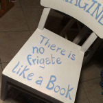 For the first chair I had in mind the beginning of a poem by Emily Dickinson, “There is no frigate like a book.” It perfectly nailed the concept of combining books with imagination for a free ticket to anywhere we’d wish to travel. I pictured a dreamy atmosphere, so I used light blue as the main color to recall the sea, and pinkish flowers to decorate and divide images from words, like a frame. White background areas accentuate the contrast between colors in both chairs.